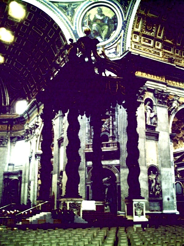 Altar Mayor: Ya en el interior de la basílica encontramos el Altar Mayor. Bajo él se ecnuentra la sepultura del primero de los pontífices, San Pedro. El baldaquino que lo corona es obra de Gian Lorenzo Bernini y sirve de dosel sobre el Altar Mayor. En este lugar solamenteel Papa puede oficiar la misa (eucaristía) en ocasiones de gran solemnidad. |