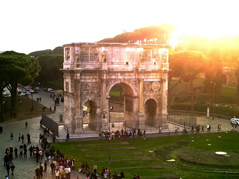 Arco de Constantino: Situado junto al Coliseo, es el arco triunfal más moderno erigido en la antigua Roma. Es del año 306 y, además de conmemorar la victoria del emperador Constantino en la batalla del Puente de Milvio, recoge una inscripción que habla del inicio del cambio religioso que este emperador promovió en favor del catolicismo. Su "instinctu divinitatis" (inspirado por la divinidad) plasman ese cambio de fe y dicen que vienen por una visión de Dios a Constantino en la que se le decía que ganaría con Milvio con el signo de la cruz. | |