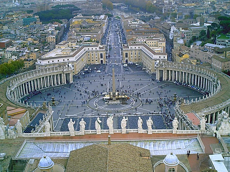 Plaza de San Pedro: En la imagen contemplamos la Plaza de San Pedro desde la cúpula de la basílica. La plaza está coronada por las estatuas de 140 santos de distintas épocas. En su interior hay dos fuentes y en el centro de la plaza un obelisco, traído desde Egipto y que se encontraba en el centro de un crico romano. Fue el Papa Sixto V quien decidió poner ahí ese obelisco, en 1586, en recuerdo del martirio de San Pedro en el circo de Nerón | |