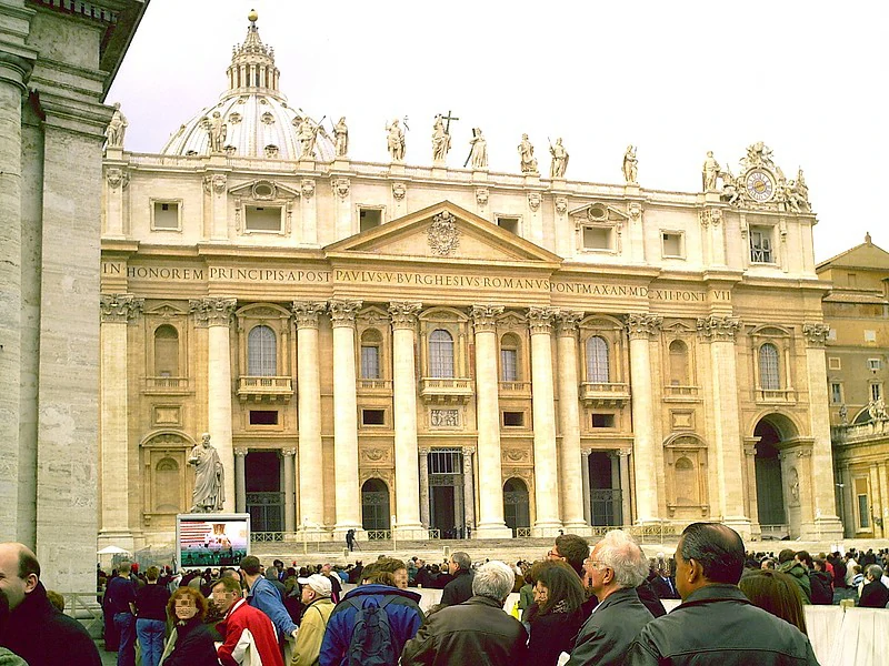 San Pedro del Vaticano: La basílica de San Pedro, en Ciudad del Vaticano, es un lugar de culto religioso, de casi dos hectáreas y media de área. Es la iglesia de mayor tamaño de la cristiandad y se erige sobre la tumba del apostol San Pedro, primero de los Papas. En contra de la creencia popular, la apilla Sixtina no se encuentra en esta basílica sino en el Palacio Apostólico que es también lugar de residencia del Papa. | |