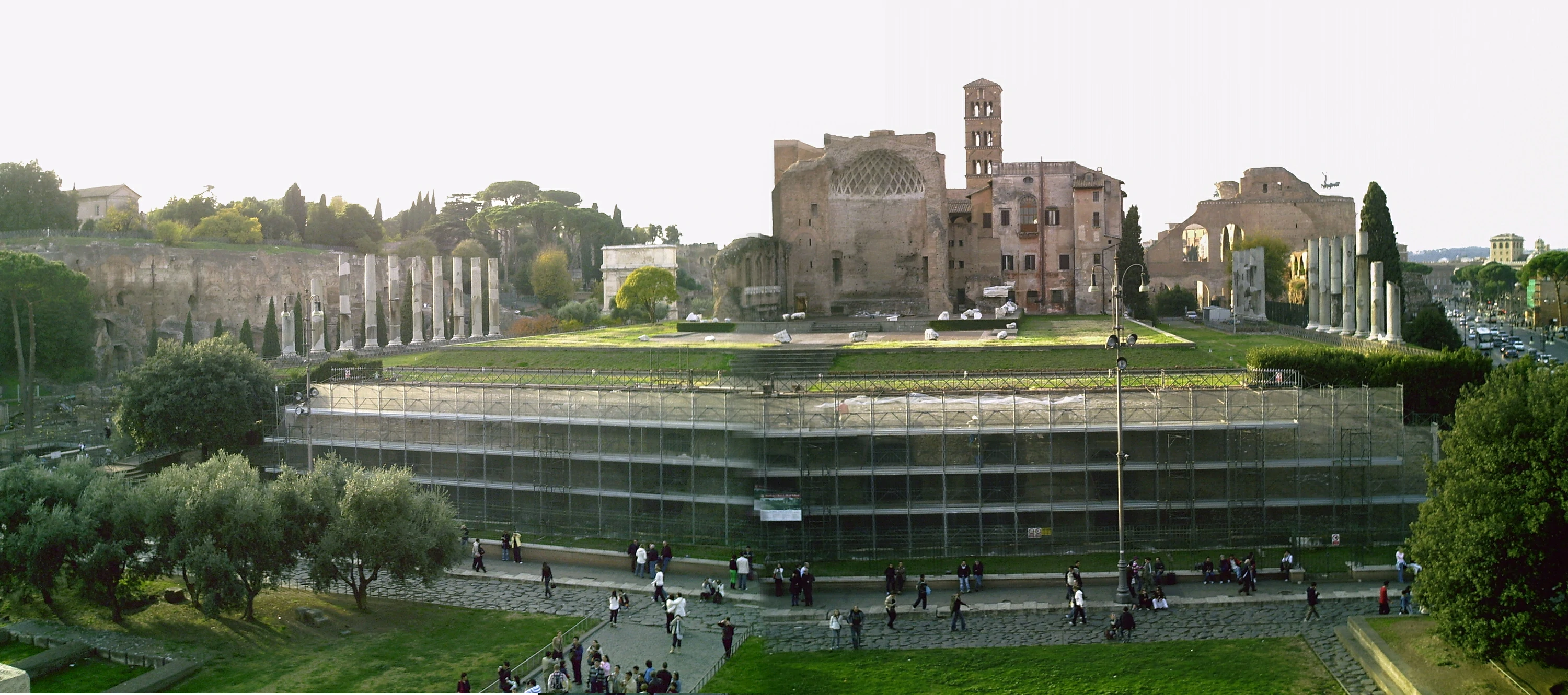 Templo de Venus y Roma: En su ubicación se alzaba el Coloso de Nerón, que fue desplazado para doder construir este templo. Fue iniciado en el 135, catorce años después de iniciarse su construcción, aunque no quedó terminado hasta el 141. Lo inició e inauguró el emperador Adriano, lo terminó el emperador Antonio Pio y lo restauró el emperador Majencio en 307, después de que fuera dañado por el fuego. | |